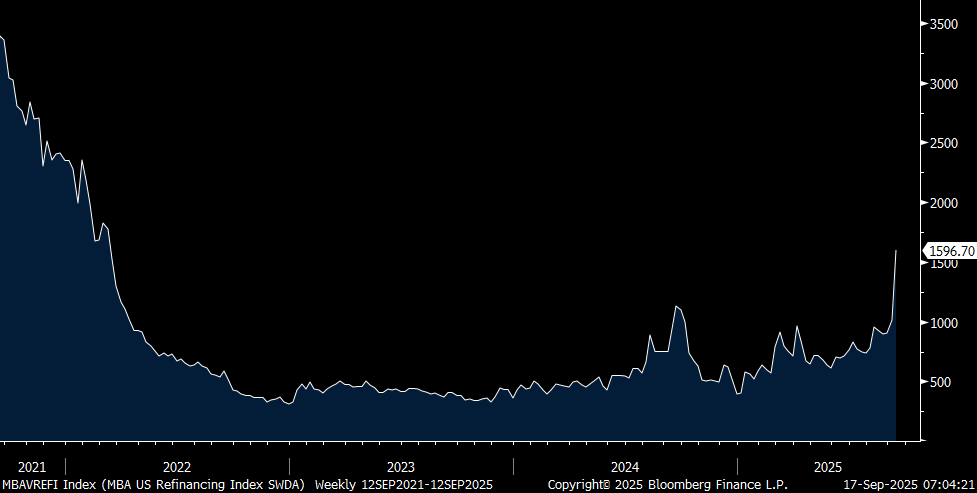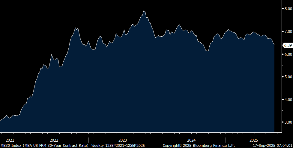 Meanwhile, the drop in long rates with the average 30 yr mortgage rate falling by another 10 bps w/o/w to 6.39% drove a 58% pop in refi applications w/o/w while purchase apps were higher by a much more modest 2.9%. That mortgage rate is the lowest in a year and assume the refi wave is from those who have 7%+ mortgages and those that want to do some cash outs with the high level of equity that many have in their homes. The mortgage rate though is still double where it was pre 2022.